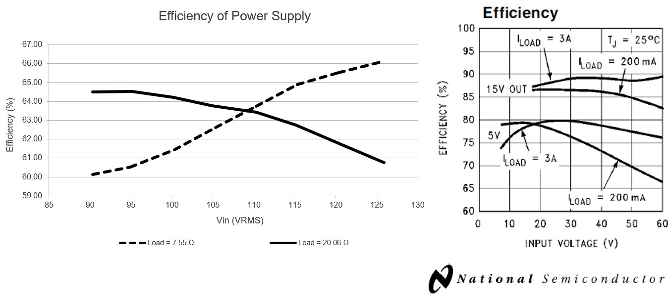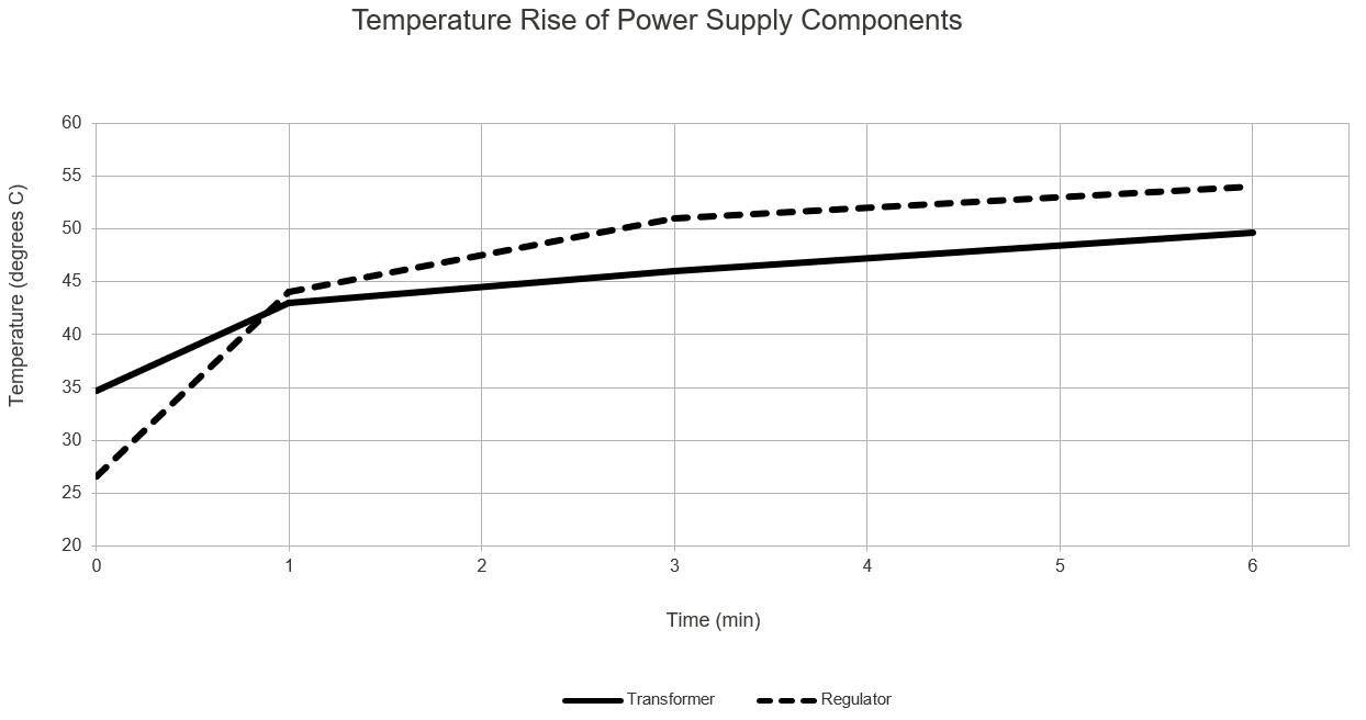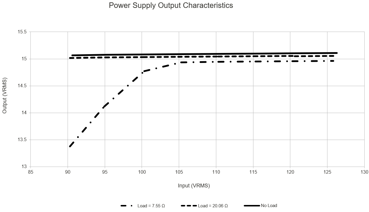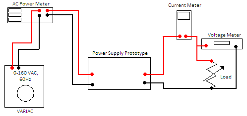 Prototype testing was carried out using two digital multimeters (DMM) and an AC power meter. The testing configuration is summarized in the figure below. An AC power meter was used to simultaneously measure input voltage and current from a Variac to the power supply. Two DMM are used to measure the corresponding output voltage and current. Variable loading was achieved by connecting one of many available resistor modules to the power supply output, including a rheostat (0-12 Ohm) and a resistor bank (100-900 Ohm). These modules were also combined to create a greater number of test cases. No load measurements were also recorded.