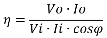 Note that the input power requires the inclusion of cosφ, the power factor, in order to calculate the real power. The product of output voltage and current gives the real power, since both the current and voltage are in phase.